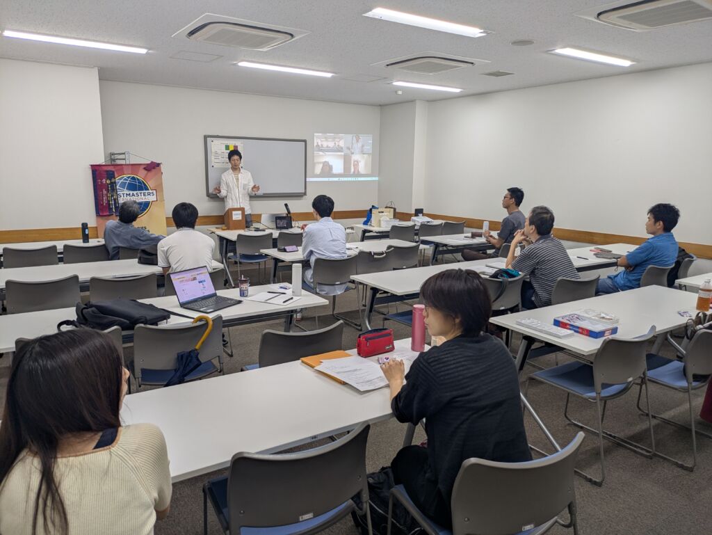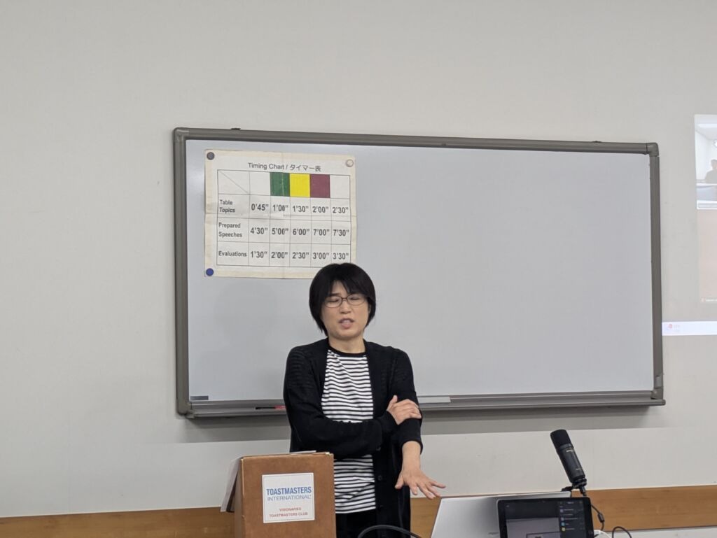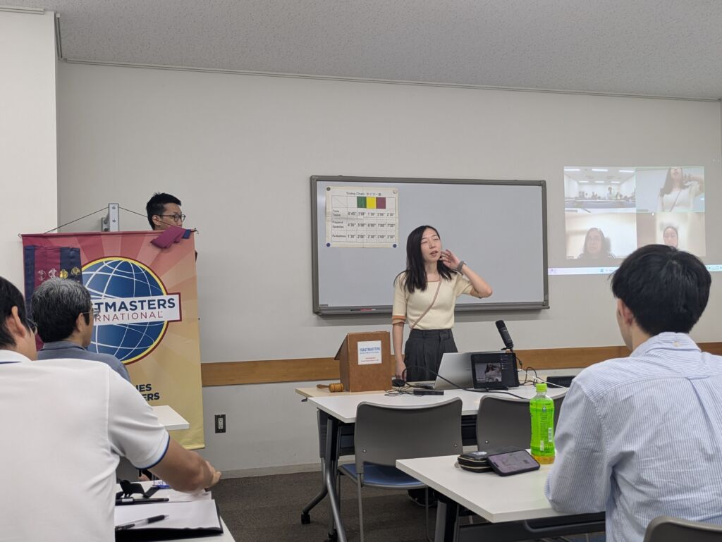 TM S. opened the meeting as Toastmaster of the Evening, welcoming our guest and setting a welcoming tone for the evening. Members shared fascinating recent experiences – TM S. recounted his family’s thrilling visit to Universal Studios Japan (securing tickets was quite the challenge!), while TM A. described her refreshing business trip to the Shonai area of Yamagata Prefecture, where the seaside atmosphere provided a peaceful escape. TM A. returned from a memorable six-week vacation to India attending her cousin’s wedding after 12 years, and TM M. celebrated the Yokohama DeNA BayStars clinching the Pacific League Championship. The energy in the room was palpable as TM T. shared his recent return from a business trip to the UK, including an inspiring visit to a London Toastmasters club with about 70 members!